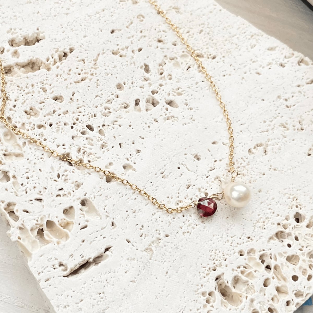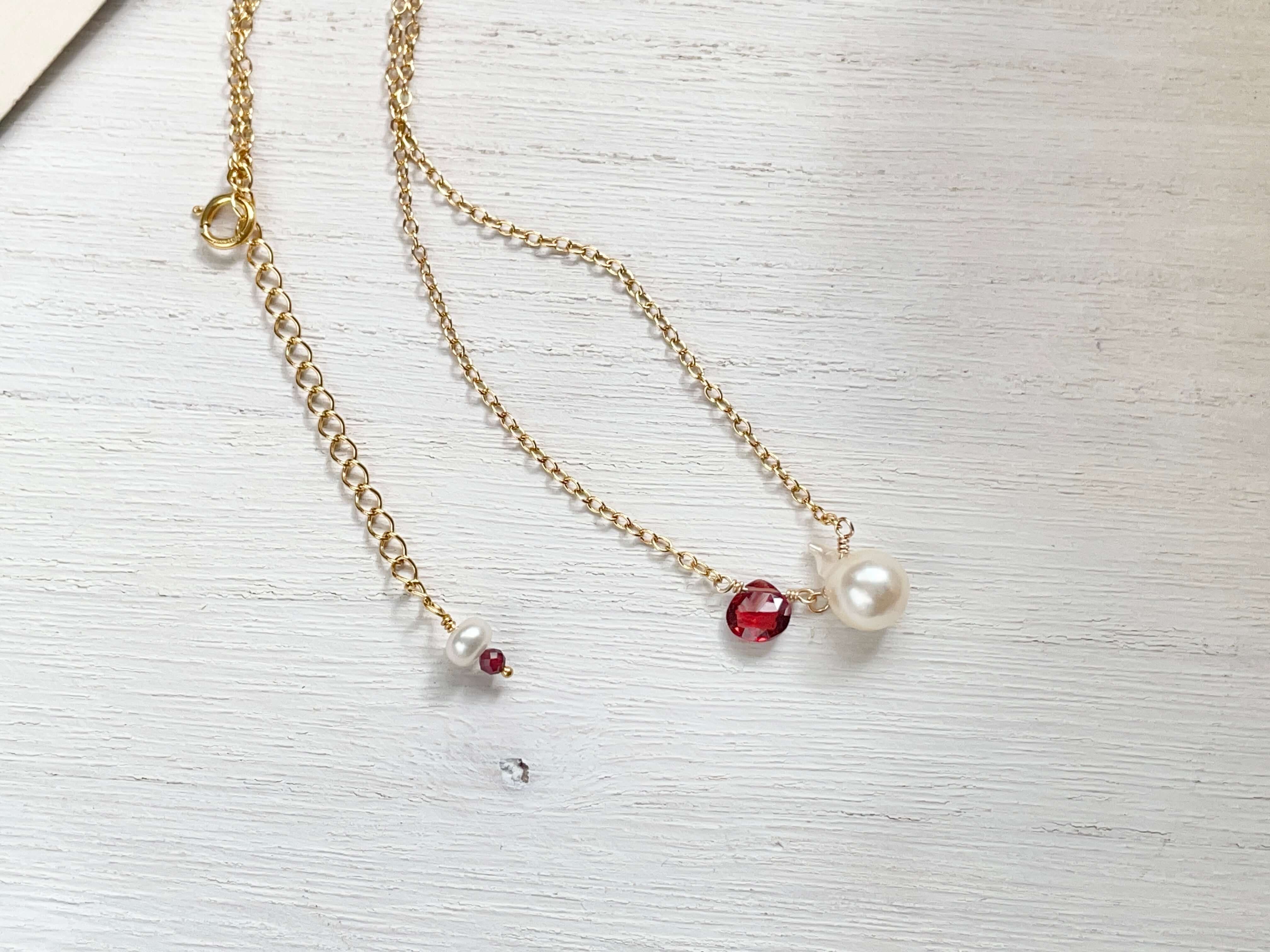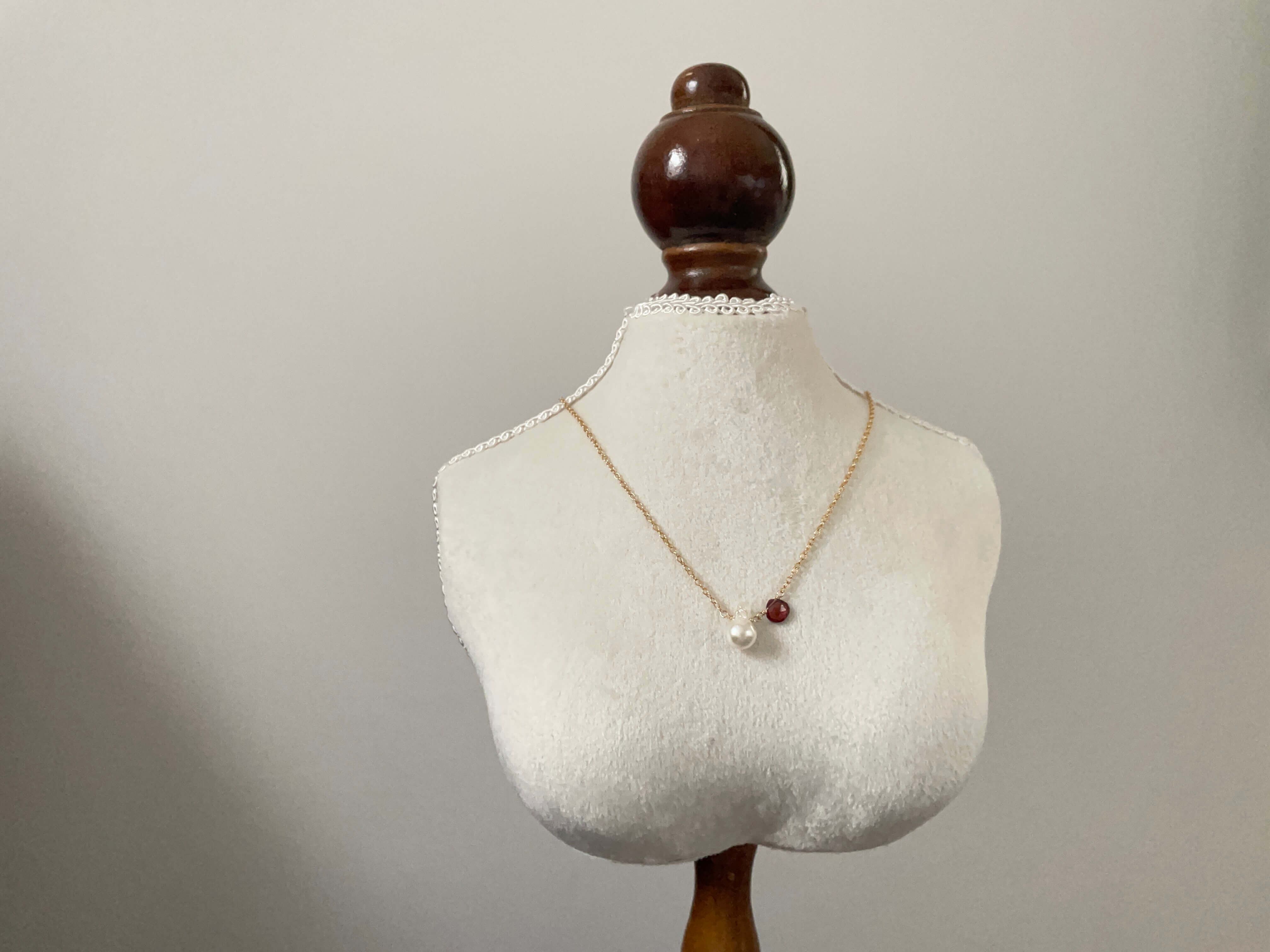 あこや真珠のバロック珠と、ガーネットを一粒つなげた チョーカー ネックレス です。