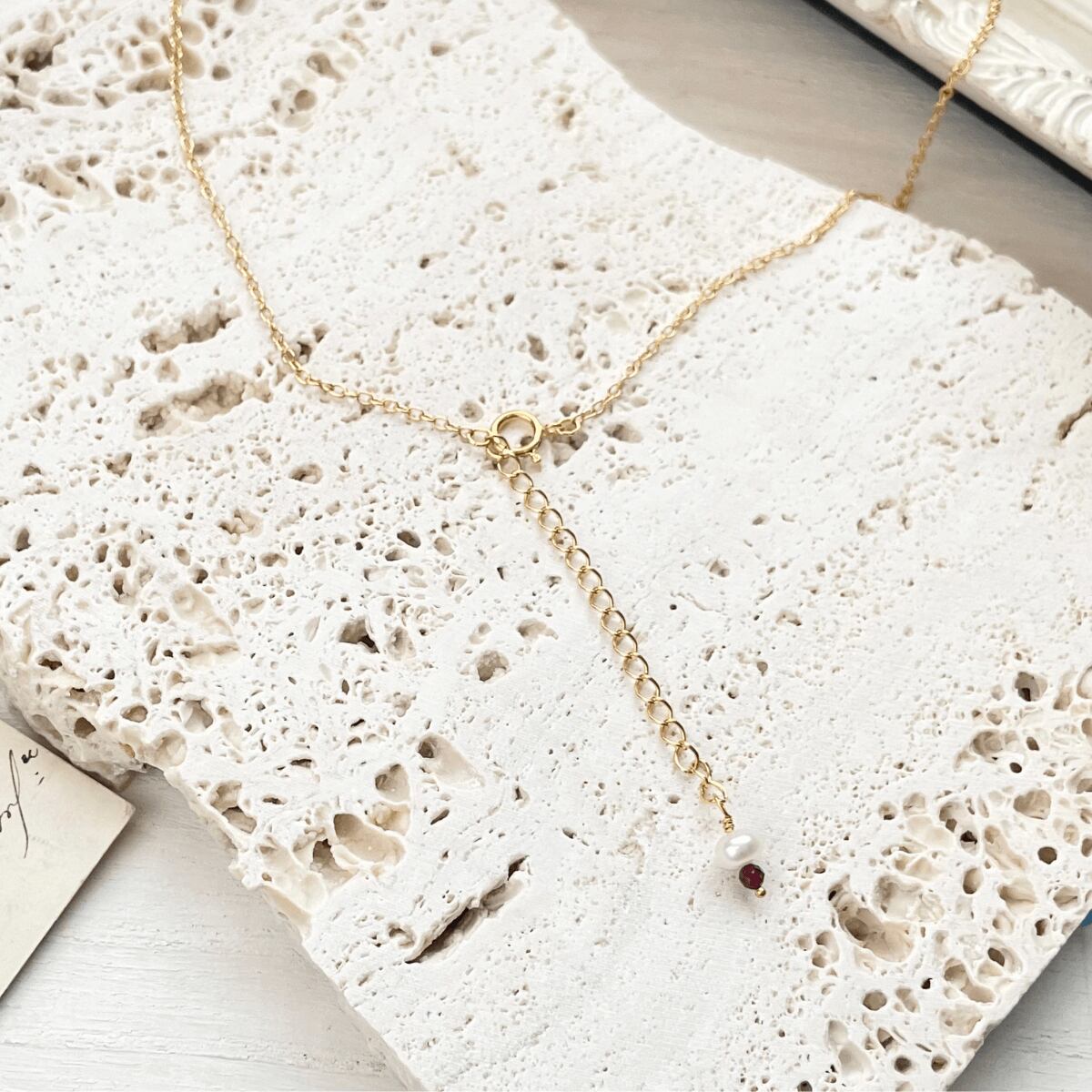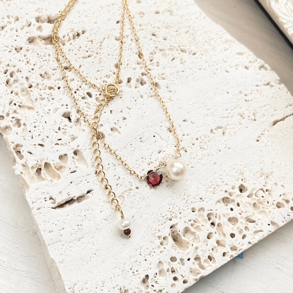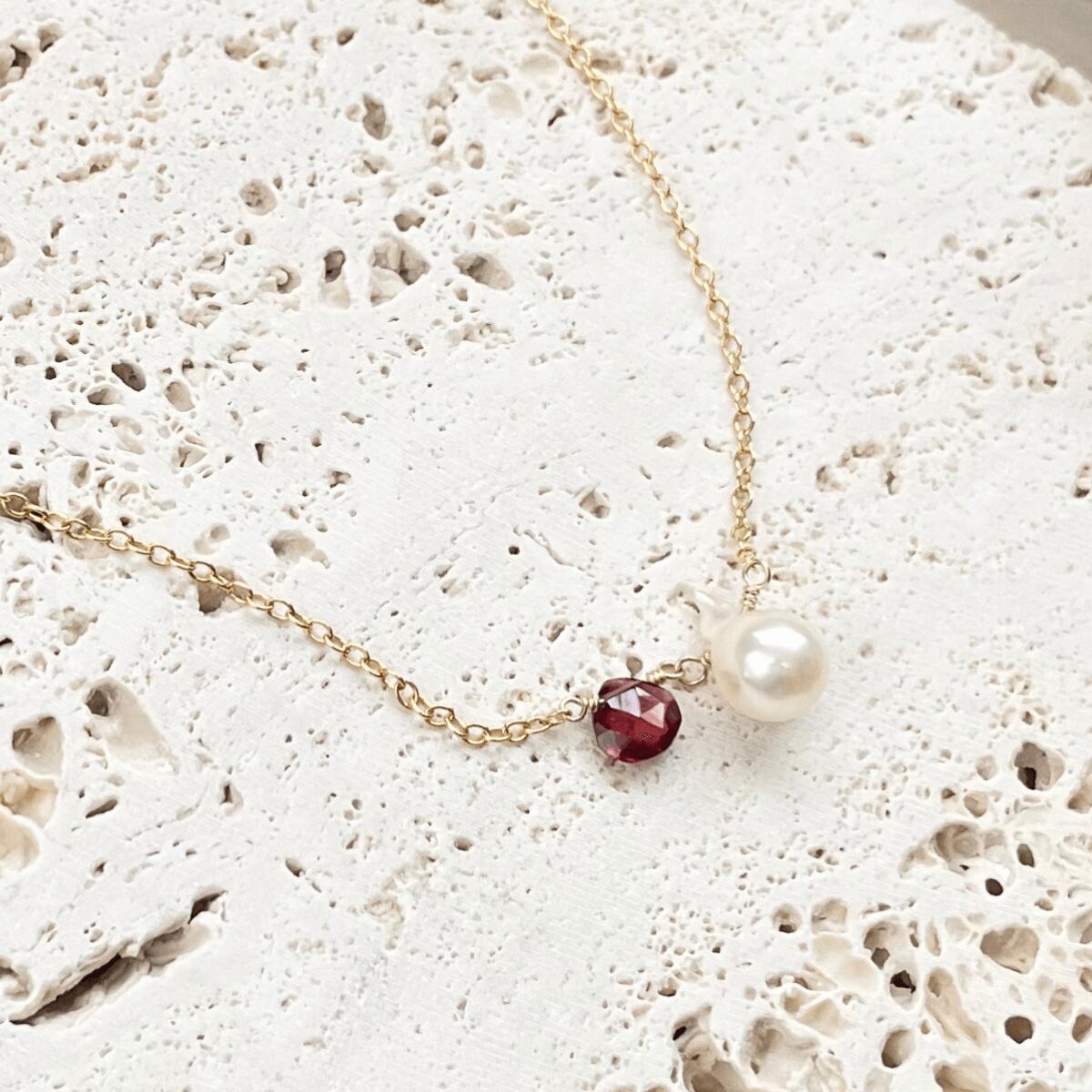 アジャスター先端には小粒の淡水バロック真珠とガーネットをあしらいました。