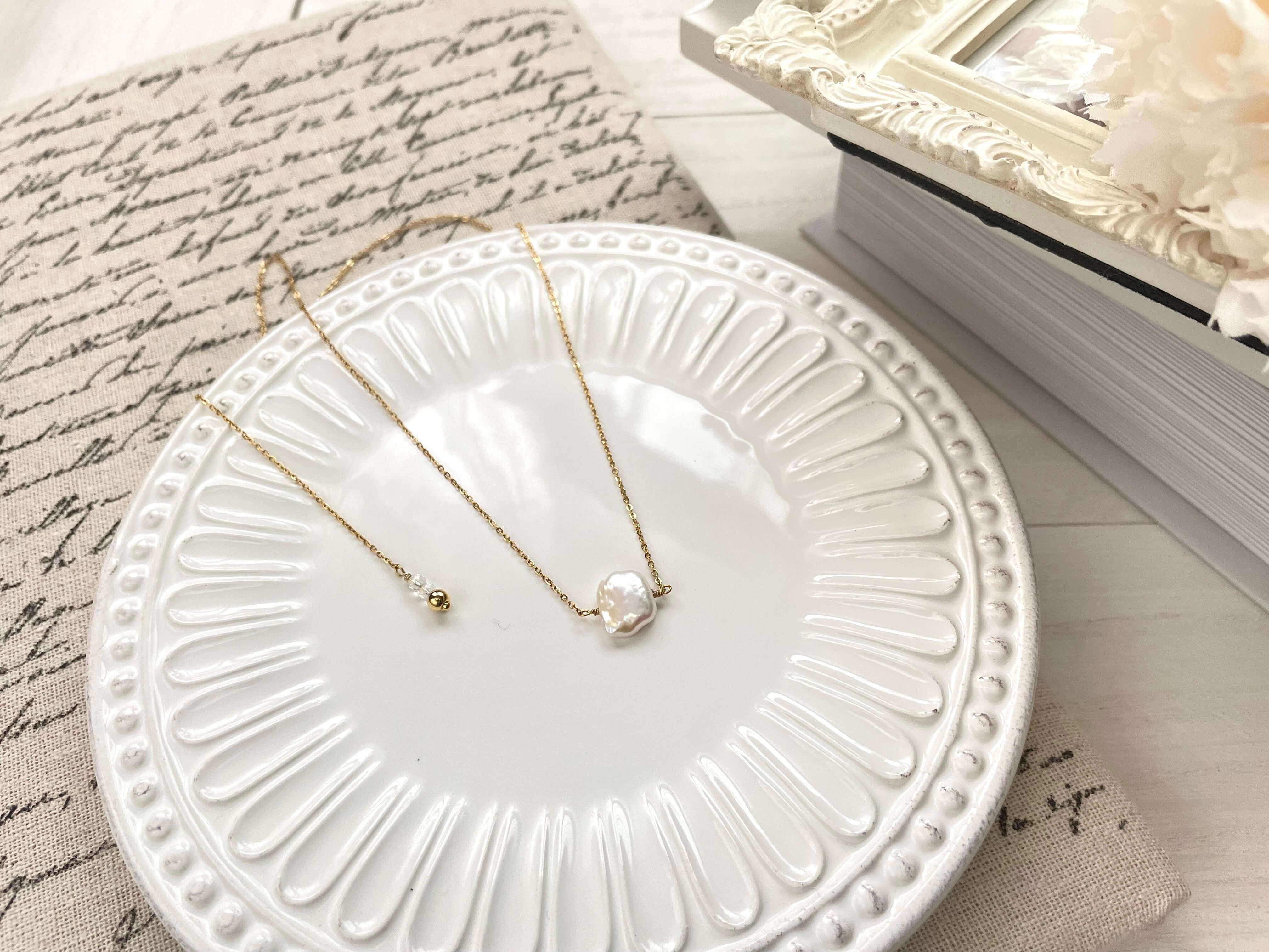 シンプルとはいえ、ユニークな形のバロック真珠が存在感を発揮してくれるので、首元から上品な輝きを放ちます。