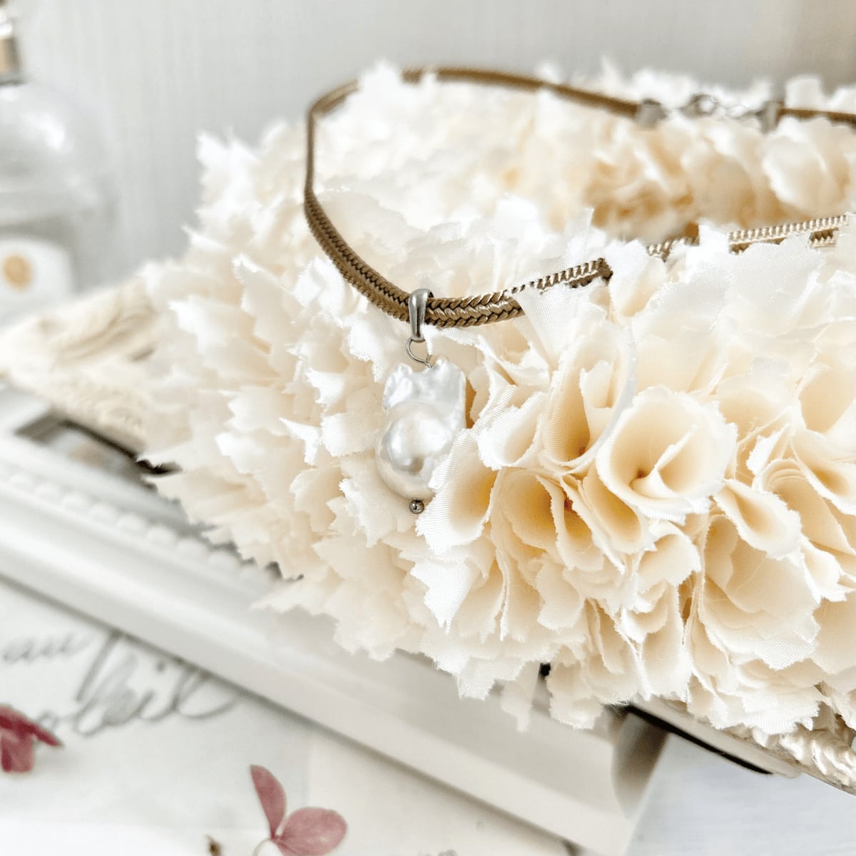 肌なじみのよいベージュのリボンコードが上品に引き立てます。