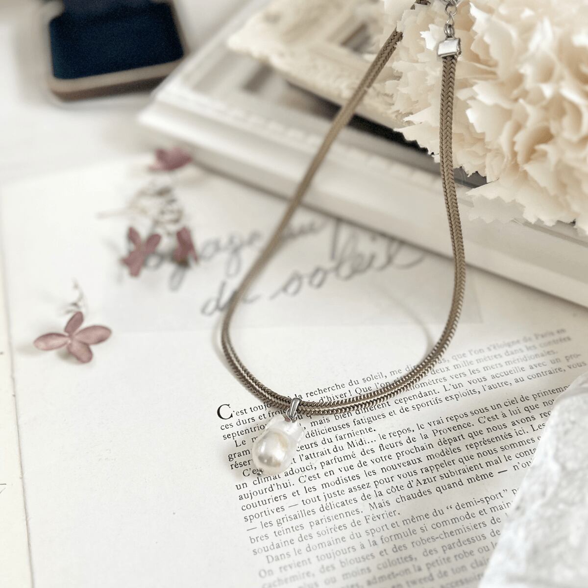 白いシャツやデニム、シンプルなニットに合わせるだけで、大人女子にこそふさわしい「気品」と「余裕」を醸し出してくれる、特別な真珠です。